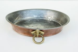 Quelle più antiche erano di terracotta o di rame stagnato, con bordo svasato, come da foto.