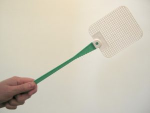 Ricordo di aver visto a casa di un anziano vicino di casa un picchietto di fattura domestica, la cui paletta era costituita da un pezzo di reticella metallica, di quelle usate come zanzariera, con i bordi protetti da un sottile orlo a cordoncino, e fissata ad un lunga asticella di legno. Funzionava alla stessa maniera di quelli posti in vendita negli empori, fatti di plastica e fil di ferro, o tutti di plastica come nell’immagine in alto.