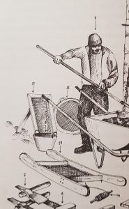 L’immagine riproduce un bel disegno di S. De Biase. Ci sono i vari tipi di vagli. Quello verticale (17) era chiamato cernetüre a rèzze, quello rotondo (18) farnarille (entrami usati a secco) e quello con le stanghe (19) il nostro cascatüre.