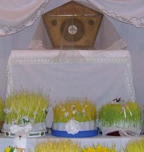 Nella foto il mobiletto-tabernacolo appare addobbato con germogli di frumento, com’è tuttora in uso nella tradizione pugliese.