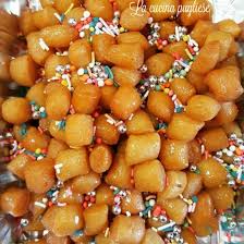 Una volta fritti,vengono ricoperti di miele o vünecùtte = vino-cotto, ossia mosto di uva o di carrube bollito e addensato.