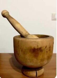 Recipiente di metallo, legno o altro materiale duro, utilizzato per ridurre in frammenti, polvere o poltiglia sostanze varie con un pestello dello stesso materiale.