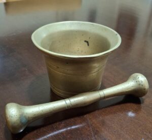 Era un motivo di orgoglio, per le nostre nonne, possedere oltre al consueto mortaio di legno, usato solo per sminuzzare il sale grosso (in sale fino non era stato ancora posto in commercio), ‘u murtéle d’abbrònze = il mortaio di bronzo, usato forse solo una volta all’anno per polverizzare la cannella o i chiodi di garofano nel preparare i dolcetti natalizi.